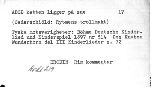 //// ABCD katten ligger på sne 17 [ //// (Cederschiöld: Rytmens trollmakt) //// Tyska motsvarigheter: Böhme Deutsche Kinder- //// lied und Kinderspiel 1^97 nr 514 Des Knaben //// Wunderhorn del III Kinderlieder s. 72 //// BRODIN Rim kommentar ////