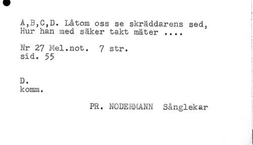 //// A,B,C,D. Låtom oss se skräddarens sed, //// Hur han med säker takt mäter .... //// Nr 27 Mel.not. 7 str. //// sid. 55 //// ! //// c //// ) //// D. //// komrn. I //// j //// PR. NODEK^lANN Sånglekar //// . ////