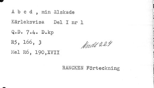 //// A b c d , min älskade r //// L //// ; //// Kärleksvisa Del I nr 1 //// a //// Q.D. 7.4. D.kp = //// < //// Mel R6, 190,XVII j //// RANCKEN Förteckning //// i //// i //// g //// F ////