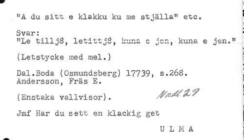 //// "A du sitt e klakku ku me stjälla" etc. ' //// i: //// Svar: ^ //// "Le tillj^y letittj^y kuna c jcn,-kuna e jen." //// (Letstycke med mel.) //// Dal.Boda (Osmundsberg) 17739, s.268. ^ //// Andersson, Fräs E. [ //// (Enstaka vallvisor). [ //// ! ////