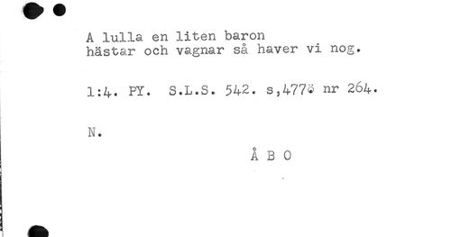 //// A lulla en liten baron //// hästar och vagnar så haver vi nog. //// 1:4. PY. S.L.S. 542. s,4773 nr 264. //// N. //// ÅBO //// * ////