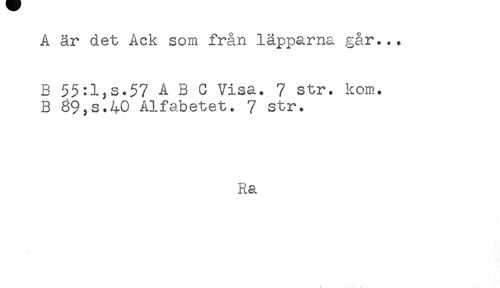 //// A är det Ack som från läpparna går... //// B 55:l,s.$7 ABC Visa. 7 str. kom. //// B 39, s. 40 Alfabetet. 7 str. //// Ra //// * ^ ^ ////