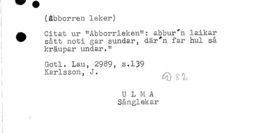 //// (Ébbcrren leker) //// I ^ Citat ur "Abborrleken": abbur^n laikar //// * sått noti gar sundar, där^n far hul så //// kräupar undar." //// Gotl. Lau, 2939, s.139 //// ! Karlsson, J. //// ! U L M A //// Sånglekar //// < ////