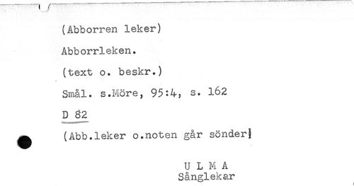 //// (Abborren leker) //// Abborrleken. //// (text o. beskr.) //// Smål. s.Möre, 95:4, s. 162 //// D 32 //// ^ (Abb.leker o.noten går sönder} //// U L M A //// Sånglekar ////