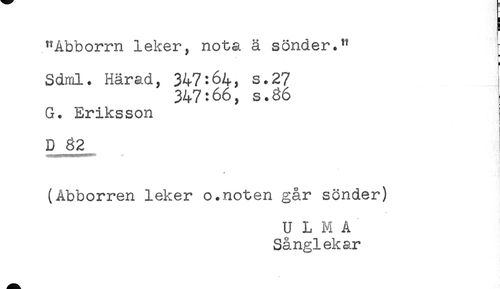 //// "Åbborrn leker, nota ä sönder." [ //// Sdml. Härad, 347:64, s.27 t //// 347:66, s.86 //// G. Eriksson //// D 82 //// (Abborren leker o.noten går sönder) //// U L M A //// Sånglekar ////
