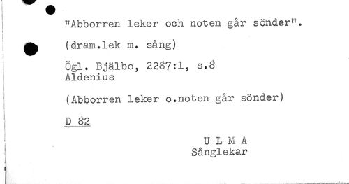 //// j "Abborren leker och noten går sönder^. //// i //// I ^ (dram.lek m. sång) //// ! Ogl. Bjälbo, 2267:1, s.3 //// I Aldenius //// t //// ' (Abborren leker o.noten går sönder) //// D 32 //// ^ U L M A //// ! Sånglekar ////