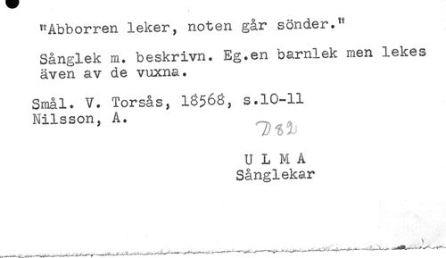 //// "Abborren leker, nonen gar suimoi. //// Sånglek m. beskrivn. Eg.en barnlek men lekes //// även av de vuxna. //// Smål. V. Torsås, 18566, s.10-11 //// Nilsson, A. //// U L M A //// Sånglekar ////