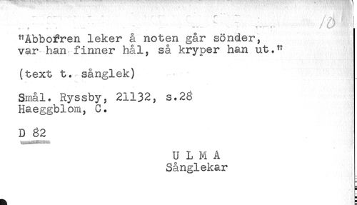 //// / /) //// r .r- * ...T" ' / , //// "Åbbofren leker å noten går sönder, //// var han-finner hål, så kryper han ut." //// (text t.^sånglek) //// Sinål. Ryssby, 21132, s.26 //// Haeggblom, C. //// D 62 //// U L M å //// Sånglekar //// H ////