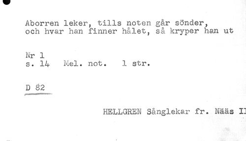 //// Aborren leker, tills noten går sönder, //// och hvar han finner hålet, så kryper han ut //// Nr 1 //// s. 14 Mel. not. 1 str. //// D §2 //// HELLGREN Sånglekar fr. Nääs 1] //// > ////