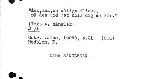 //// "Ack,ack,du dåliga flicka, //// på den tid jag höll dig äå kär." //// (Text t. sånglek) //// D 71 //// Gstr. Valbo, 10060, s.21 (8:0) //// Hedblom, F. //// ULMA SÅNGLEKAR ////