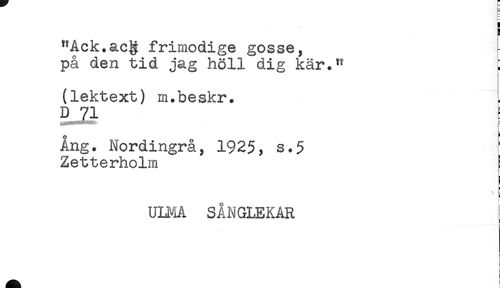 //// H //// ^Ack.ac^ frimodige gosse, //// på den tid jag höll dig kär." ; //// i //// < //// < //// (lektext) m.beskr. //// D 71 ^ //// Ång. Nordingrå, 1925, s.5 //// Zetterholm ] //// ULMA SÅNGLEKAR ////