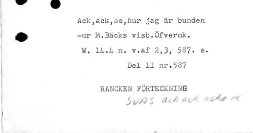 //// ! Ack,ack,se,hur jag är bunden //// t //// ^^ -ur M.Bäcks visb.öfvermk. //// W. 14^4 v.af 2,3, 587. s. //// i Del II nr.537 //// ! - - ' ' //// E //// * //// * RANCKEN FÖRTECKNINB ////
