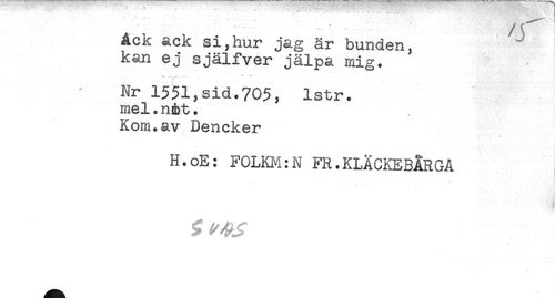 //// Ack ack si,hur jag är bunden, //// kan ej själfver jälpa mig. //// *-. - .. *** //// Nr 1551,sid.705, lstr. //// mel.nåt. //// Kom.av Dencker //// ** * . . *'. * . //// H.oE: F0LKM:N FR.KLÄCKEBÅRGA ////