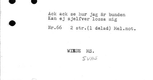 //// ) //// Ack ack se hur jag är bunden //// Kan ej sjelfver lossa mig //// Nr.66 2 str.(l delad) Mel.not. //// i //// ! //// WIBDE MS. ////