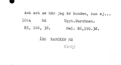 //// Ack ack se här jag är bunden, kan ej... //// 10:4 MA Uppt.Durchman. //// R5, 166, 3g. Hel. R6,190.38. //// ÅBO RANCKEN MS ////
