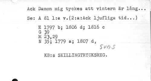 //// Ack Damon mig tyckes att vintern ar lang... , //// Se: A Si l:a v.(2:a:Ack ljufliga tid...) //// E 1797 b; 1306 d; 1816 c //// G 39 //// M 23,29 //// N 35; 1779 a; 1807 d, //// KB:s SKILLINGTRYCKSREG. //// j //// i //// f //// i //// < ////