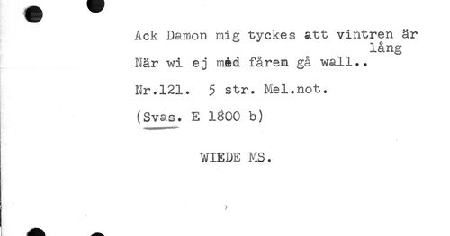 //// Ack Damon mig tyckes att vintren är //// lång //// När wi ej med fårem gå wall.. //// Nr.121. 5 str. Mel.not. //// . //// (Svas. E 1800 b) //// j, //// WIEDE MS. ////
