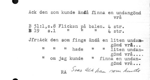 //// Ack den som kunde ändå finna en undangömd //// o i //// vra //// ! //// B 51:1,s.8 Flickan på balen. 4 str. //// B 19 s.l " " " 4 str. //// i //// i //// Jfr:Ack den som finge ändå en liten undan- //// gömd vrå... //// " " " hade " ^ liten undan- ///