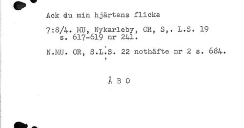 //// Ack du min hjärtans flicka //// 7:8/4. MU, Nykarleby, OR, S,. L.S. 19 //// s. 617-619 nr 241. //// N.MU. OR, S.L^S. 22 nothäfte nr 2 s. 684. //// ) //// ÅBO ////