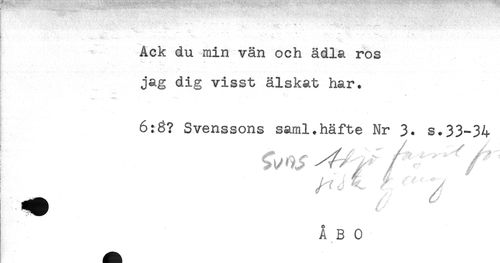 //// . , - . //// -- //// Ack du min vän och ädla ros //// - //// - //// jag dig visst älskat har. //// 6:3? Svenssons saml.häfte Nr 3. s.33-34 //// ^ j ^ / //// * ////