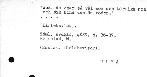 //// "RCK, au osar sa val som den törniga ros //// och din kind den är roder." //// * . . . //// (Kärleksvisa). //// Sdml. Årdala, 4889, s. 36-37. //// Palmblad, W. //// ; //// (Enstaka kärleksvisor). //// ^ U L M A ////