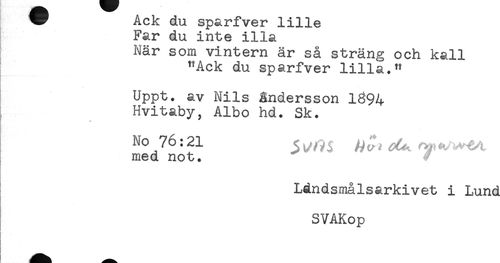 //// Far du inte illa //// När som vintern är så sträng och kall //// "Ack du sparfver lilla." //// Uppt. av Nils Andersson 18% //// Hvitaby, Albo hd. Sk. //// * //// No 76:21 < ^ //// med not. # //// Ldndsmålsarkivet i Lund //// SVAKop ////