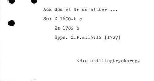 //// Ack död vi är du bitter ... //// ^ Se: Z 1600-t c //// Zz 1762 b //// Upps. Z.P.s.15:12 (1727) //// KB:s skillingtrycksreg. //// /'"-<* ////