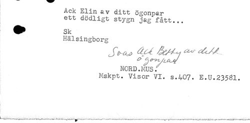 //// i^j-m v aitu ogonpar //// ett dödligt stygn jag'fått... //// Hälsingborg //// NORD.MUS. //// Mskpt. Visor VI. s.407. E.U.23581. ////