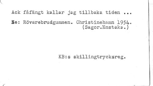 //// Ack fåfängt kallar jag tillbaka tiden ... //// * //// Se: Rövarebrudgummen. Christinehamn 1954* //// (Sagor.Enstaka.) //// < //// KB:s skillingtrycksreg. //// * ////
