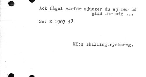 //// Ack iagel varför sjunger du ej mer så //// glad för mig ... //// Se: E 1903 i3 //// ) //// KB:s skillingtrycksreg. ////