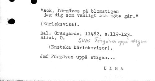 //// "Ack, förgäves på blomstigen //// jag dig som vanligt att möta går." //// (Kärleksvisa). //// Dal. Grangärde, 11462, s.119-123. //// Blixt, 0. //// (Enstaka kärleksvisor). //// Jmf Förgäves uppå stigen... //// U L M A ////