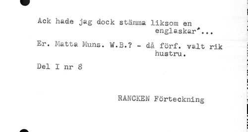 //// Ack hade jag dock stämma liksom en //// englaskar*... //// t //// ; //// i //// Er. Matta Muns. W.B.? - då förf. valt rik i //// hustru. ! //// Del I nr 8 ^ //// E //// RANCKEN Förteckning //// B //// s ////