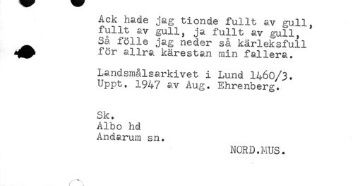 //// ACK nade jag tionde fullt av gull, //// fullt av gull, ja fullt av gull, //// Sa fölle jag neder så kärleksfull //// för allra kärestan min fallera. //// Landsmålsarkivet i Lund 1460/3. //// Uppt. 1947 av Aug. Ehrenberg. //// Sk. //// Albo hd //// An