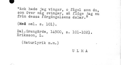 //// "Ack hade jag vingar, o fågel som du, //// som över mig svingar, så flöge jag nu //// fran dessa förgängelsens dalar." //// (MeA mel. s. 101). //// Dal.Grangärde, 14900, s. 101-102). //// Eriksson, L. //// (Naturlyrik m.m.) //// U L M A ////