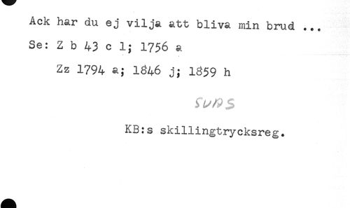 //// ACK nar du ej vilja att bliva min brud ... //// Se: Z b 43 c 1; 1756 a //// Zz 1794 a; 1846 j; I859 h //// KB:s skillingtrycksreg. ////