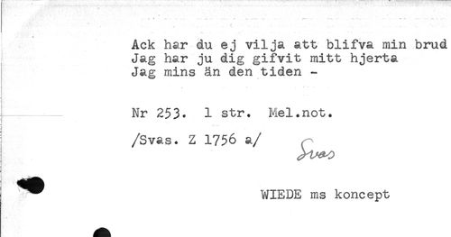 //// Ack har du ej vilja att blifva min brud //// Jag har ju dig gifvit mitt hjerta //// Jag mins än den tiden - //// Nr 253. 1 str. Mel.not. //// ] //// /Svas. Z 1756 a/ //// ^^ WIEDE ms koncept ////