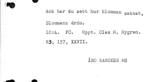 //// ] Ack har du sett hur blomman saknat, //// Blommans dröm. //// 10:4. PÖ. Uppt. Clas M. Nygren. //// t //// R3, 157, XXVII. //// ÅBO RANCKEN MS ////