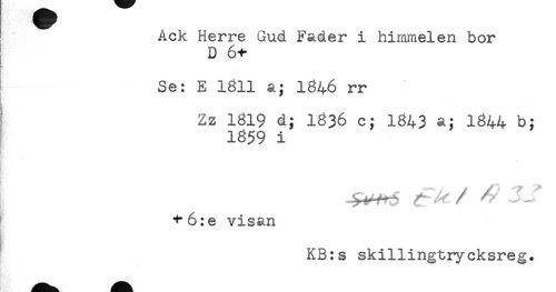 //// i " Ack Herre Gud Fader i himmel en bor //// D 6+ //// - //// Se: E 1811 a; 1846 rr //// ' Zz 1819 d; 1836 c; 1843 a; 1344 b: //// 1859 i //// *t*6:e visan //// KB:s skillingtrycksreg. ////