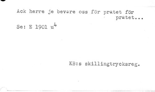 //// Ack herre je bevare oss för pratet för //// pratet... //// Se: E 1901 u^ //// KB:s skillingtrycksreg. //// ^ [j...... ..... ////
