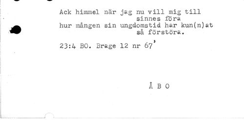 //// j ACK nimmel nar jag nu vm mig ^111 //// sinnes föra //// ^^ hur mången sin ungdomstid har kun(n)at //// så förstöra. //// I 23:4 BO. Brage 12 nr 67' //// ÅBO //// /' ^ \ ////