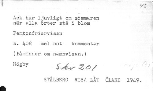//// Ack hur ljuvligt om sommaren //// när alla örter stå i blom //// Femtonfriarvisan //// s. 406 mel not kommentar //// (Påminner om namnvisan.) //// STÅLBERG VISA LÅT ÖLAND 1949. ////