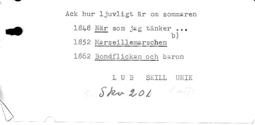 //// Ack hur ljuvligt är om sommaren //// ^^ I846 När som jag tänker ... //// 1652 Marseillemarschen //// 1862 Bondflickan och baron //// L U B SKILL UNIK ////