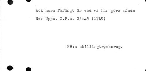 //// Ack huru fåfängt är vad vi här göra månde //// Se: Upps. Z.P.s. 25:45 (1749) //// KB:s skillingtrycksreg. //// - ////