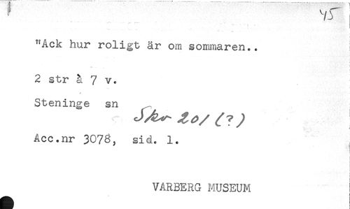 //// - . - ,-. - .. - .... . , //// "Ack hur roligt är om sommaren.. //// 2 str å 7 v. //// Steninge sn //// Acc.nr 3078, sid. 1. //// i //// t //// VARBERG MUSEUM ////
