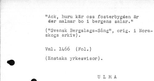 //// & //// b' * * //// "Ack, huru kär oss fosterbygden är //// der malmar bo i bergens salar." //// ("Svensk Bergslags-Sång"; orig. i Nora- //// skogs arkiv). //// i //// } . //// Vml. 1466 (Fol.) //// T- //// ! __(Enstaka yrkesvisor). //// it //// h ///