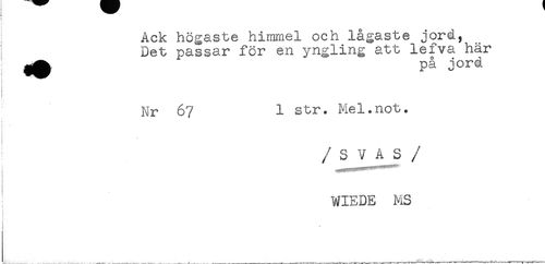 //// Ack högaste himmel och lågaste jord, //// Det passar för en yngling att lefva här //// på jord //// Nr 67 1 str. Mel.not. //// / S VJ^S / //// WIEDE MS //// t //// . __ _ _ ___._____,---.---^-..-r-----f-- --rr----,
