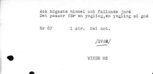 //// Ack högaste himmel och fallande jord //// Det passar för en yngling,en yngling så god //// Nr 6? 1 str. Mel not. //// /SVAN/ //// ^ WIEDE MS ////