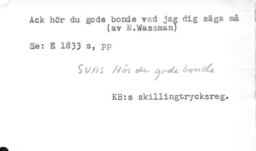 //// Ack hör du gode bonde vad jag dig säga må //// (av N.Wassman) //// Se: E 1633 s, pp //// KB:s skillingtrycksreg. ////