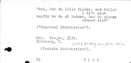 //// "Ack, hör du lilla flicka, vad"faller //// i ditt sinn //// varför är du så ledsen, har du mistqt //// vännen din?" //// ("Urgammal kärleksvisa"). //// Dal. Venjan, 3535. //// (Enstaka kärleksvisor) . //// ^94 U L H A ////