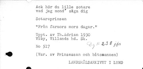//// ACK nor au ii±ie sökare //// vad jag mond' säga dig //// Sotareprinsen //// "Från farmors mors dagar." //// Uppt. av Th.Adrian 1930 //// Viby, Villands hd. Sk. //// No 517 //// ^^ (Var. av Prinsessan och båtsmannen) //// LANDSMÅLSARKIVET I LUND ////